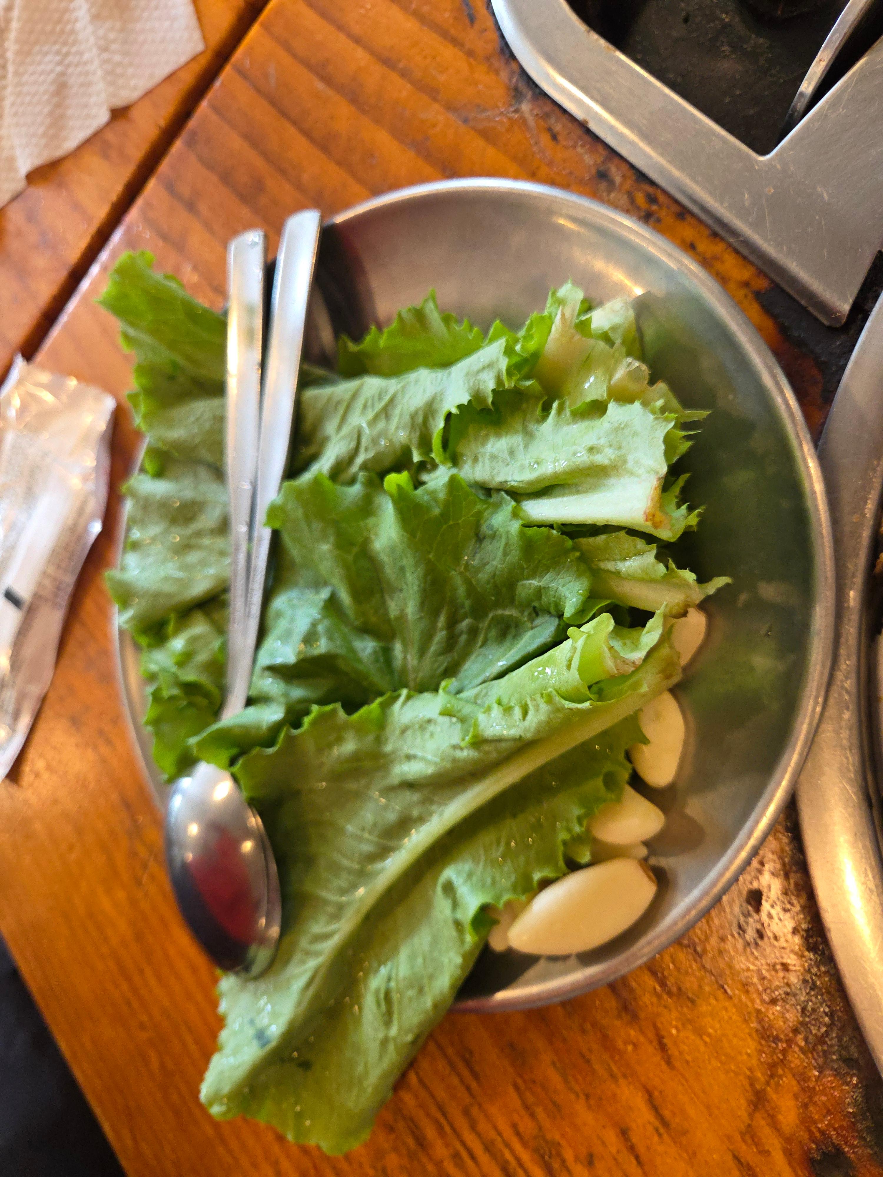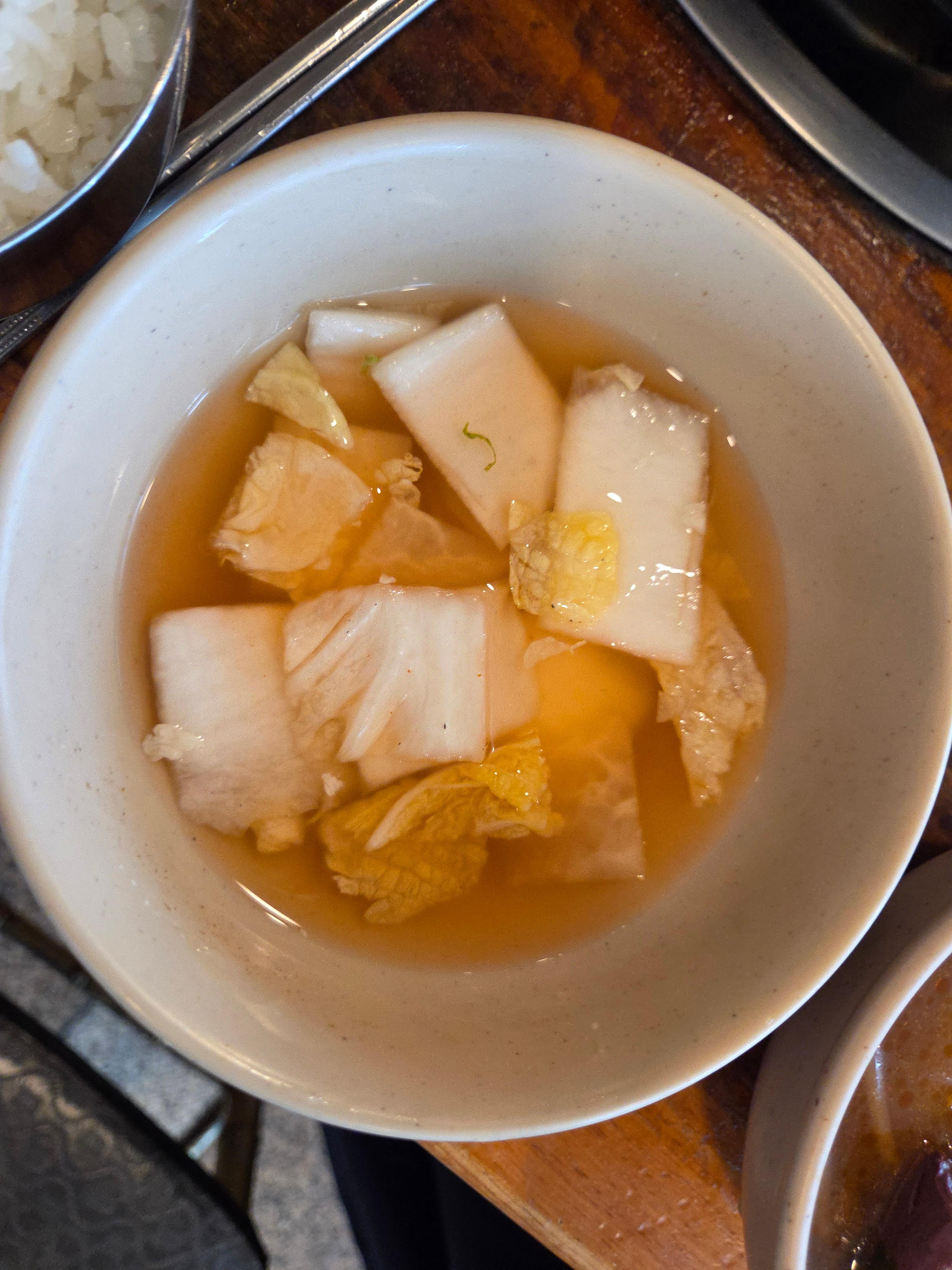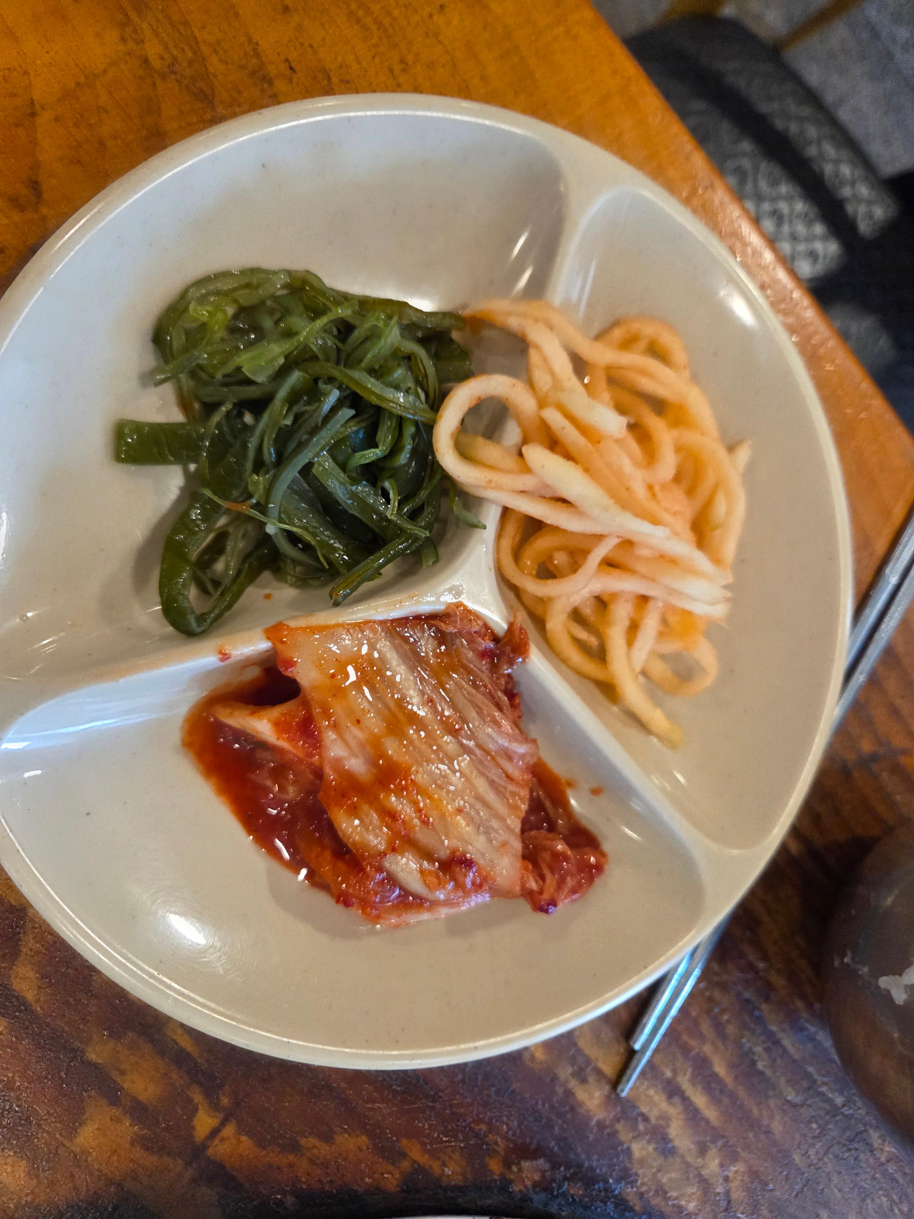주문을 마치면 기본찬이 차려집니다. 아삭한 김치와 새콤한 무생채, 미역줄기무침까지. 그리고 이곳의 또 다른 주인공, 바로 '선지 해장국'이 서비스로 나와요. 이게 또 무한리필이라는 사실! 얼큰하고 구수한 국물이 입맛을 확 돋워준답니다.