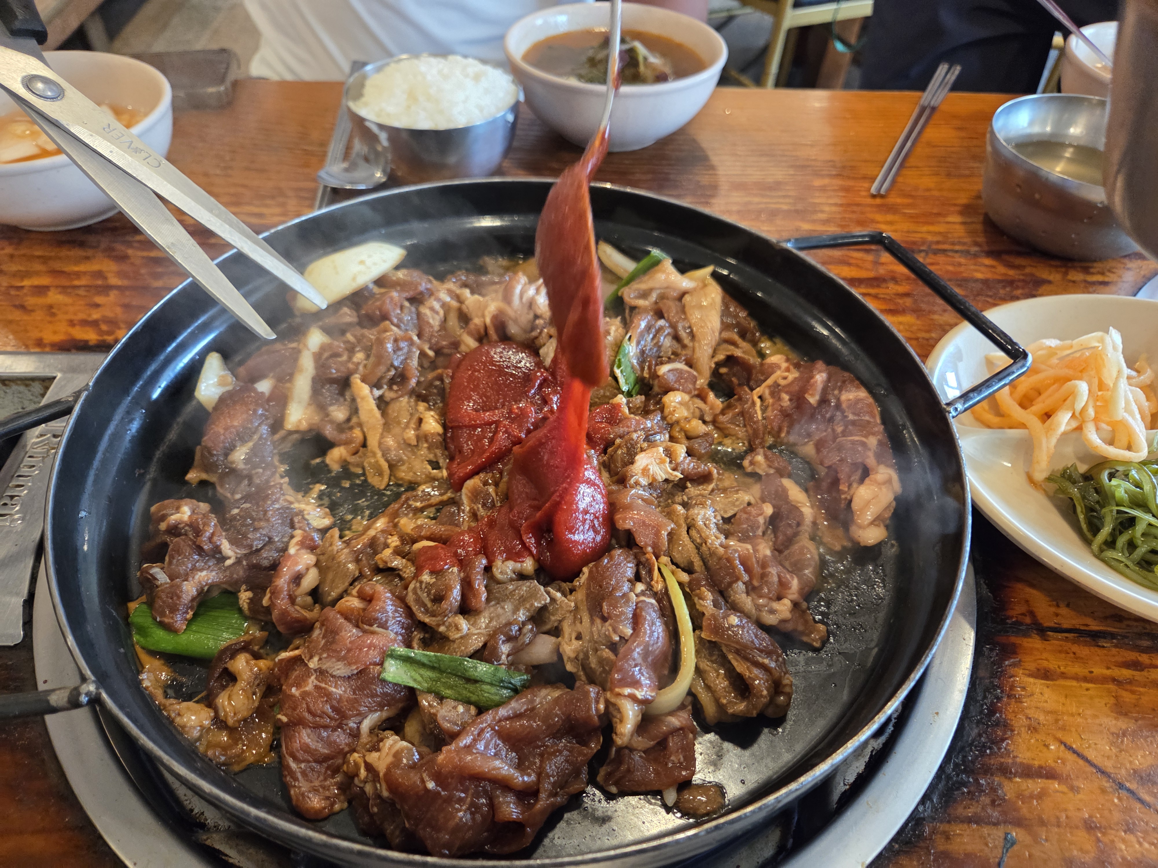 드디어 불판 위에 돼지불고기가 올라갑니다. 얇게 썬 돼지고기와 파, 양파가 함께 나와요. 고기가 어느 정도 익으면 이모님이 오셔서 비법 고추장을 턱 올려주시는데, 이때부터 맛있는 쇼가 시작됩니다. 지글지글 익어가는 소리와 매콤달콤한 냄새가 침샘을 마구 자극해요.