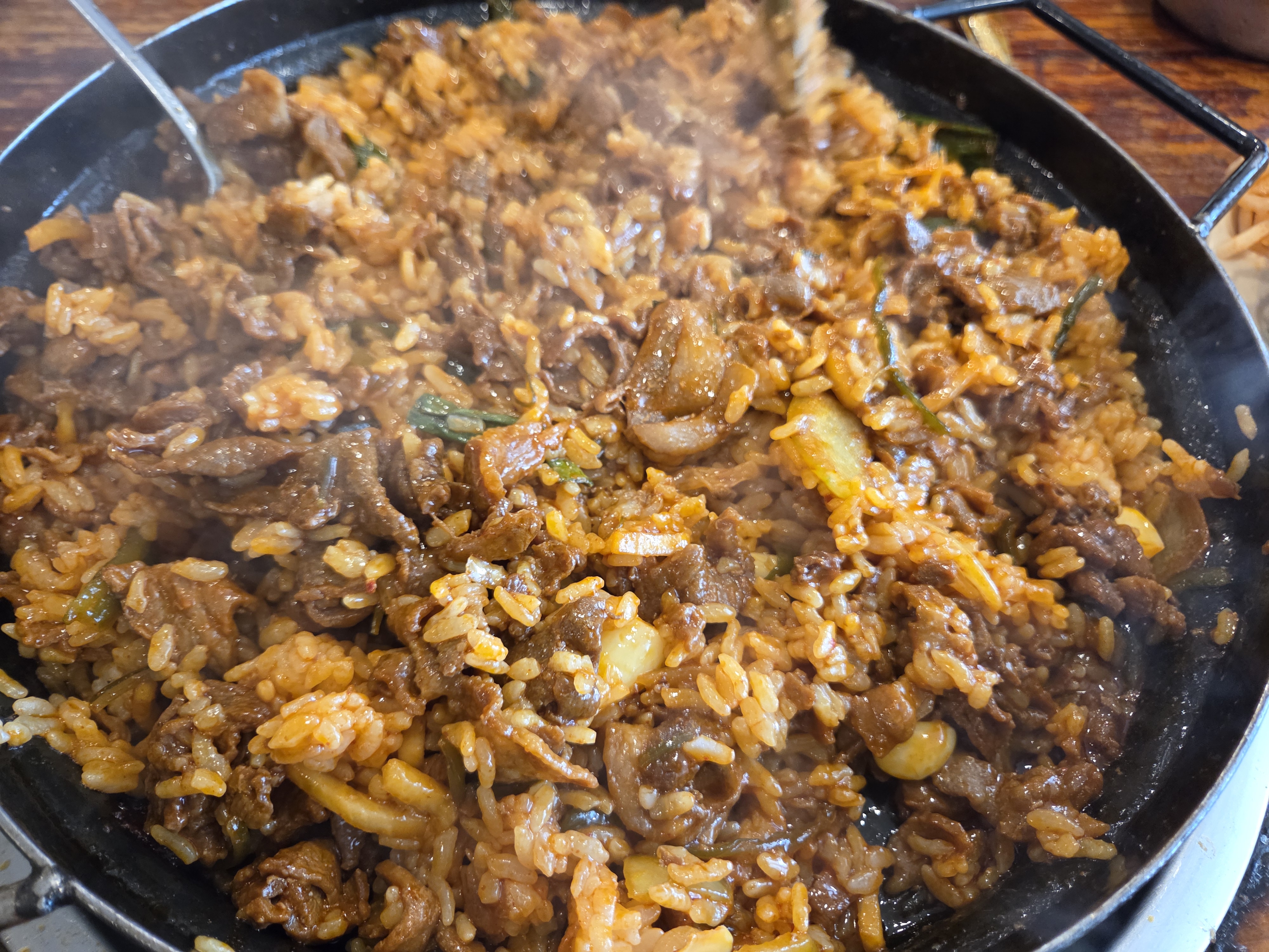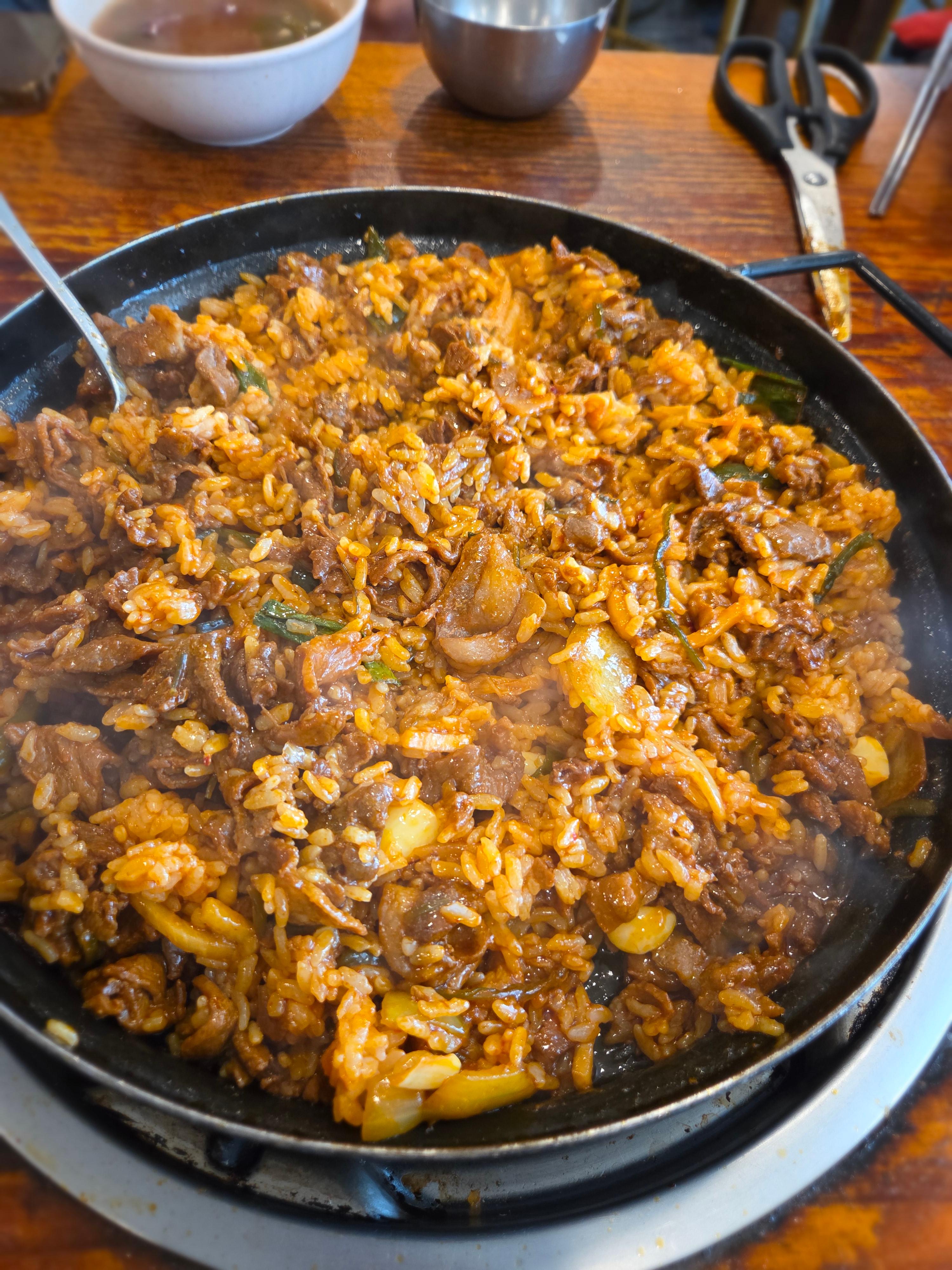 고기를 어느 정도 건져 먹고 나면 드디어 하이라이트 순서입니다. 남은 고기와 양념에 공깃밥과 김치, 무생채를 넣고 셀프로 볶아주면 되는데요. 자작한 양념이 밥알 하나하나에 코팅되어 감칠맛 폭발하는 볶음밥이 완성됩니다. 살짝 눌어붙은 누룽지를 긁어 먹는 재미는 덤이고요!